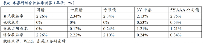 券种综合收益率=名义收益率-税收成本-资本占用成本。其中,名义收益率采用2024年7月11日的数据,税收成本主要包括增值税、附加税和所得税,资本占用成本=风险权重*资本充足率*资本利润率。资本充足率和资本利润率我们采用了2024Q1数据,分别为12.35%和9.35%。