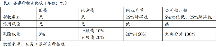 券商考虑配债时,往往会衡量各券种的收益和成本因素。从成本来看,国债与地方债由于税收优惠政策无税收成本与信用风险,所获利息收入也无需缴纳增值税,其次为同业存单,信用风险相对较低,其利息收入同样可免增值税,而公司信用债的信用风险最高,并且需要对利息收入缴纳增值税与所得税。