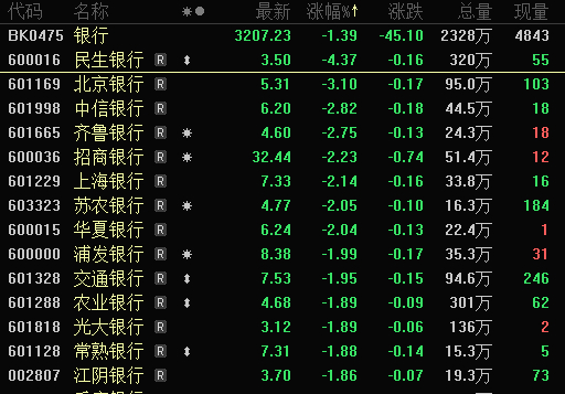 此前一直强势的银行板块出现跳水,民生银行大跌超4%,北京银行跌超3%,此前持续创新高的农业银行、工商银行等均绿盘运行,银行板块仅郑州银行一只个股飘红。