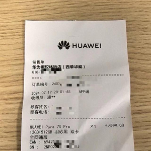 熊先生发来的购买小票显示,“HUAWEI Pura 70 Pro12GB+512GB 羽砂黑双卡全网通版”价格为6999元。购买时间为2024年7月17日。