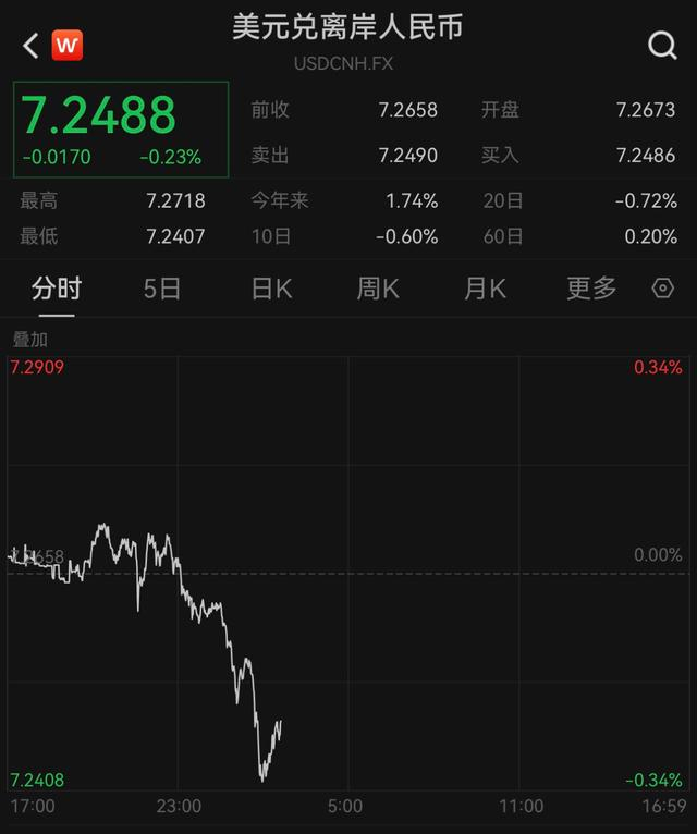 7月25日,离岸人民币对美元汇率先后升破7.27、7.26和7.25关口,截至发稿,盘中最高升值至7.2407,较日内最低点7.2718升值超过300点。