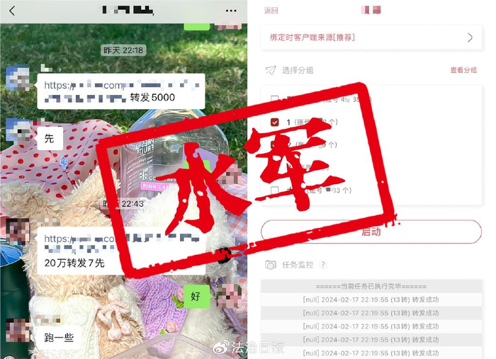 案例10:镇江侦破蒋某等人刷量控评“网络水军”案。今年3月,蒋某等人持有大量“水军”账号,定制多款批量登录、一键操作的群控软件,有偿为文娱、饭圈、网络直播等从业人员或群体提供虚假“转赞评”服务,以实现打榜、上热搜等目的,非法获利数百万元。蒋某等8人已被公安机关依法采取刑事强制措施,案件正在进一步侦办中。