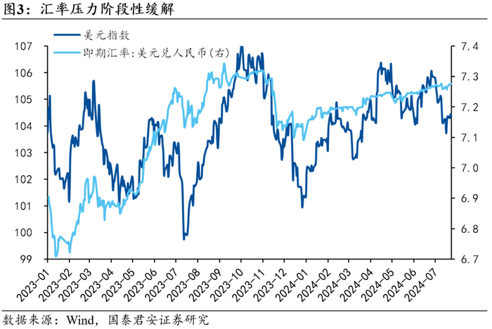 货币政策面临多重目标:稳汇率、缓缩表、保息差,三者相互制约,而当前汇率压力有所缓解,因而货币政策的约束也有所减弱,现阶段强调以我为主。尽管美联储接连放鸽,但降息进展受到政治博弈影响,仍存在一定不确定性,如若9月靴子落地,降息后强化美国经济软着陆预期,反而支撑美元走强逻辑。考虑到三中全会带来的稳增长预期,我们预计三季度中后期货币政策可能有进一步的宽松操作。