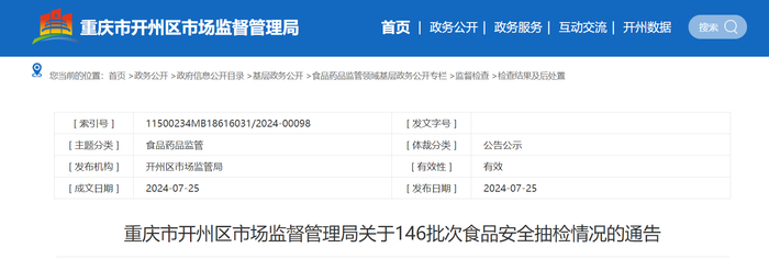 重庆市开州区市场监督管理局关于146批次食品安全抽检情况的通告