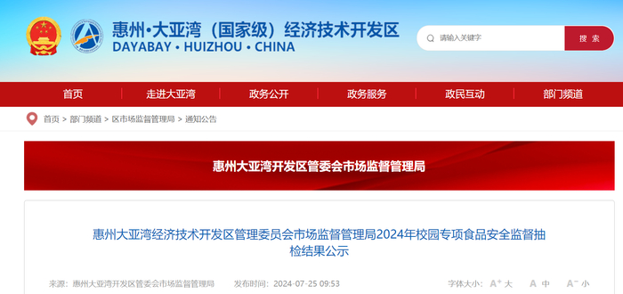 【广东省】惠州大亚湾经济技术开发区管理委员会市场监督管理局2024年校园专项食品安全监督抽检结果公示
