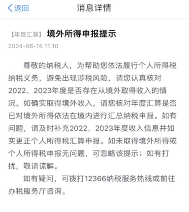 近期,个税APP“收入纳税明细”新增五项,引起广泛关注。同样也在今年6月,多位有海外收入的客户收到“境外所得申报提示”,提示要求纳税人认真核对2022、2023年是否存在从境外取得的收入情况,及时补充更正个人所得税申报。