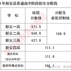 根据2024年新安县普通高中学校招生计划、考生志愿和中考成绩,参考地理生物等级,现将2024年新安县普通高中阶段招生分数线公告如下: