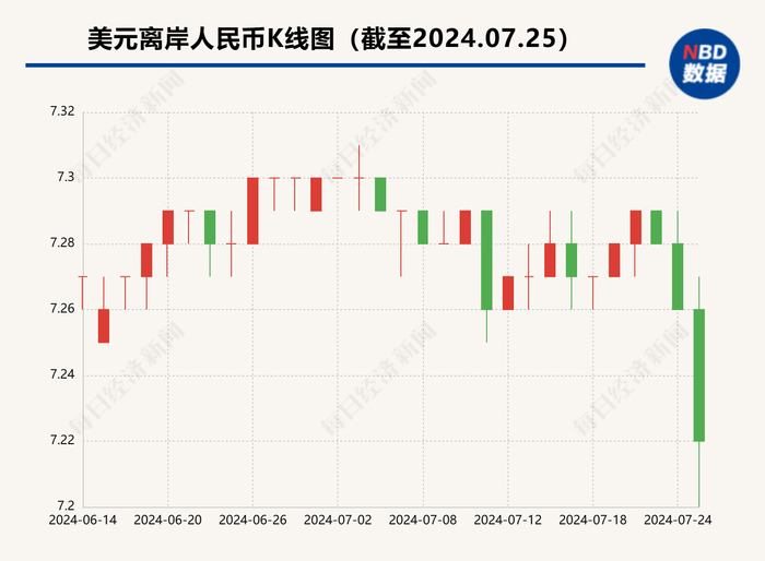 7月25日午后,在岸、离岸人民币对美元汇率盘中接连升破7.26、7.25、7.24、7.23、7.22、7.21多个关口,盘中最高升至7.2050,较前一交易日7.2760的收盘价大涨超700点,升幅接近1%,16时30分,人民币对美元汇率日间收盘报7.2203,较上一交易日上涨557个基点,并创下近两个月来的新高,进入夜盘交易时间后涨幅则有所收窄。
