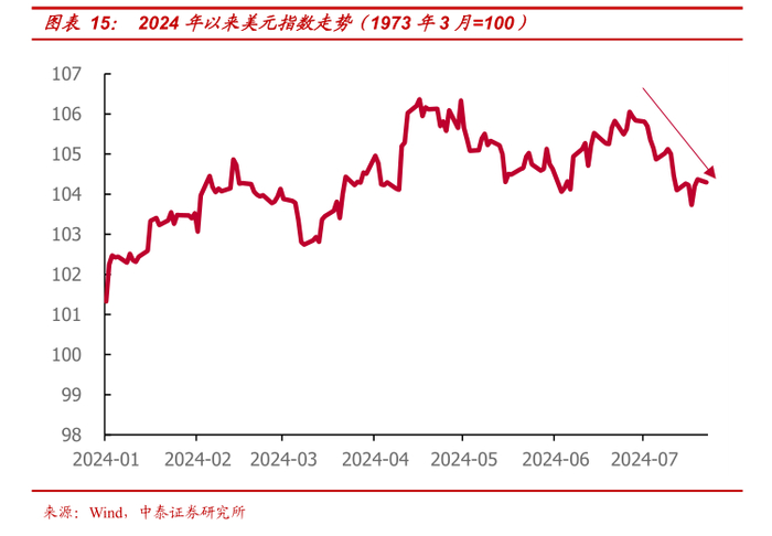 从美元指数来看,近一个月以来,美元指数整体震荡回落,6月下旬至今跌幅约1.7%,截至发稿报104.12。
