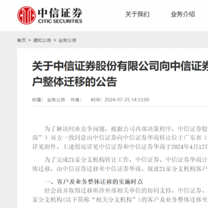同时,公告指出,为最大限度保护投资者合法权益,中信证券和中信证券华南本着充分尊重投资者选择意愿的原则,制定了客户及业务整体迁移对相关分支机构客户影响的解决方案。对于不愿意随所在分支机构迁移转入中信证券华南的客户,或者不愿意提前暂停参与前述交易业务、客户账户及适当性管理业务的客户,可于公告发布之日起至2024年8月11日期间,由客户本人持有效身份证件按规定程序办理转、销户手续。就客户办理转、销户手续,中信证券、中信证券华南尽可能予以便利。截至2024年8月11日仍未到中信证券办理转、销户手续的客户,视为同意实施整体迁移方案并入中信证券华南,后续由中信证券华南受理客户各项需求并提供优质服务,依法承担相应的职责。