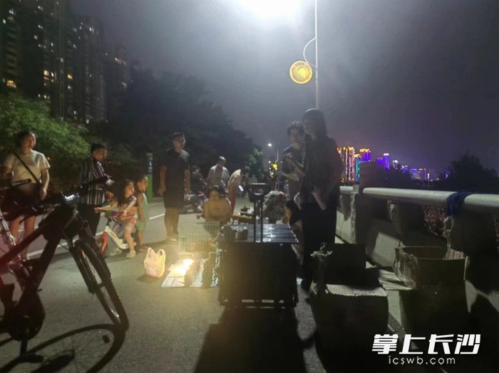 “冰西瓜,冰西瓜,十元两盒,十元两盒……”夜晚,浏阳河河堤夜市人头攒动,地摊沿着河堤铺向尽头,摊贩之间紧紧挨着。