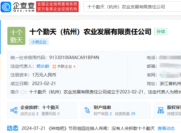 据了解,十个勤天(杭州)农业发展有限公司是“十个勤天”主动提出建立的,这也是为什么他们被叫做“十个勤天”。此外,公司成立的第二天,《种地吧》节目的出品方之一蓝天下(浙江)传媒集团有限公司就提交了多件“十个勤天”商标的注册申请。