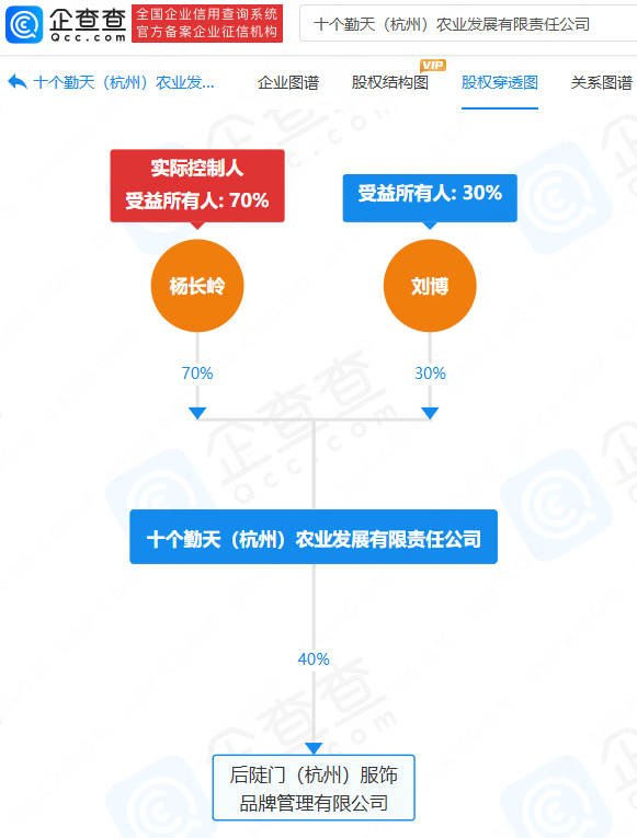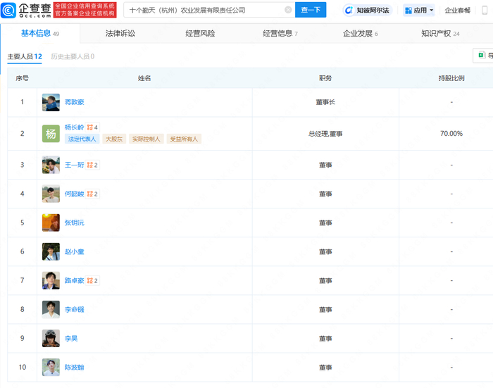 企查查APP显示,《种地吧》关联公司十个勤天(杭州)农业发展有限责任公司成立于2023年2月,法定代表人为《种地吧》导演杨长岭,由杨长岭和节目副导演、执行制作人刘博分别持股70%、30%,蒋敦豪等十人分别担任董事长和董事,未持有股权。此外,该公司对外投资1家公司,为后陡门(杭州)服饰品牌管理有限公司,由王一珩担任董事长,何浩楠(何懿峻)、鹭卓(路卓豪)担任董事,同样未持有股权。
