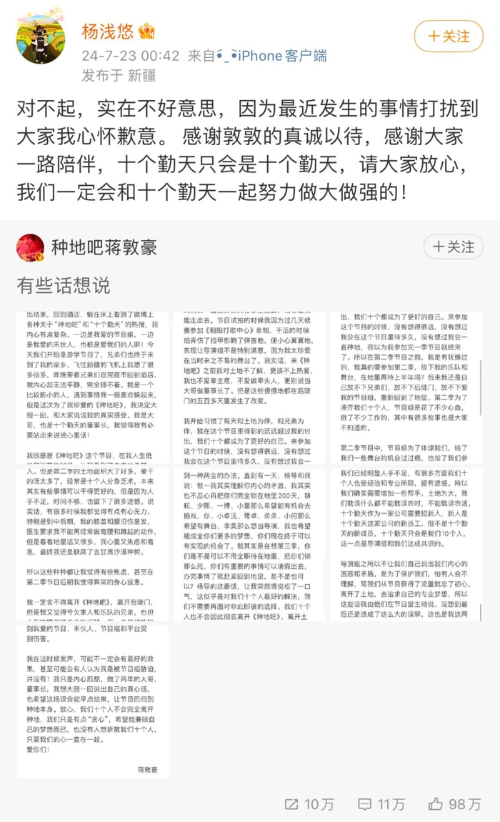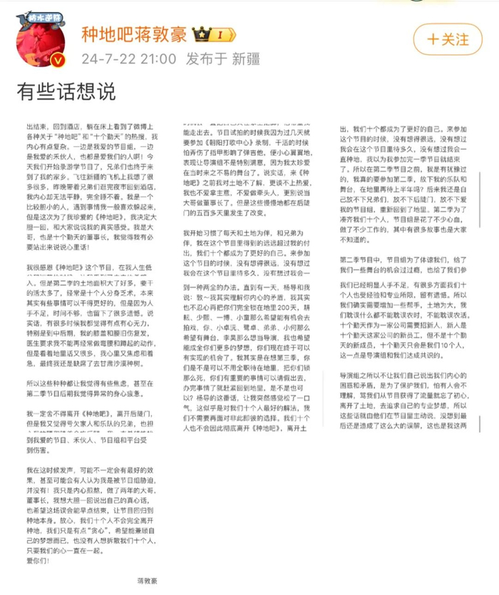 十个勤天成员蒋敦豪发表长文安抚粉丝