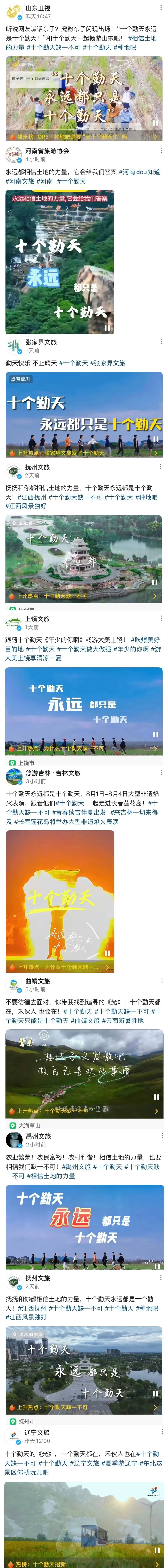 这几天,多地文旅也陆续带话题发文支持十个勤天。