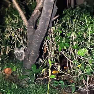 我顺着小道,快步朝里走去。在池塘的前面,一片半米高的灌木丛看上去没有什么异样。下一秒,当我蹲下,将手电筒对准前方,一只有着浓厚“黑眼圈”的小动物正在安静地和我对视。它不是流浪猫,它就是一只貉。