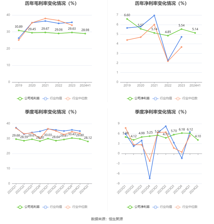 2024年上半年,公司毛利率为28.98%,同比下降0.37个百分点;净利率为5.14%,较上年同期上升0.01个百分点。从单季度指标来看,2024年第二季度公司毛利率为28.12%,同比下降0.52个百分点,环比下降1.68个百分点;净利率为4.10%,较上年同期下降0.63个百分点,较上一季度下降2.02个百分点。