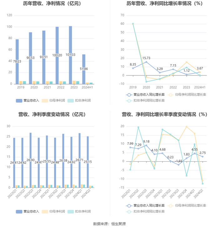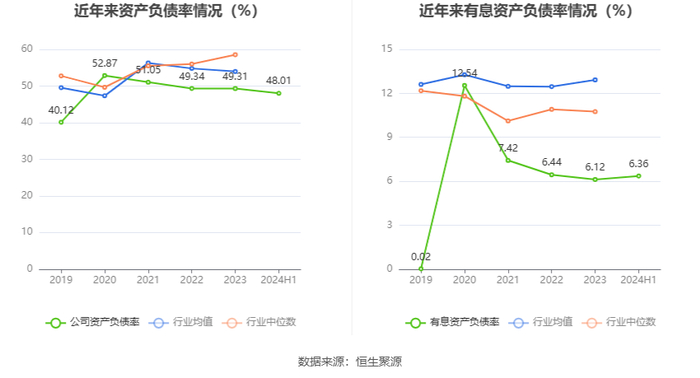 在偿债能力方面,公司2024年上半年末资产负债率为48.01%,相比上年末下降1.30个百分点;有息资产负债率为6.36%,相比上年末上升0.24个百分点。