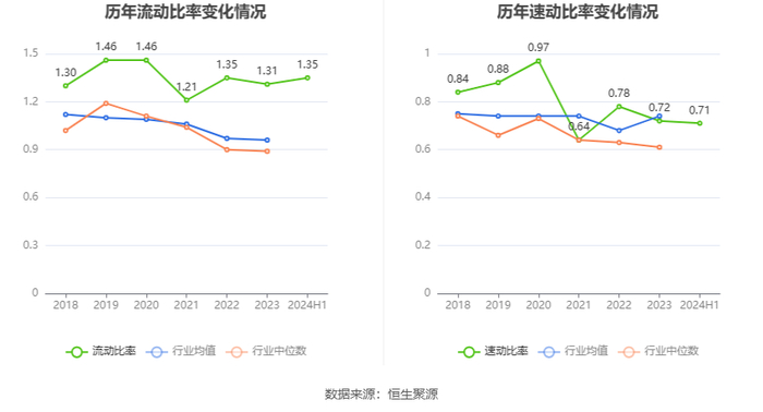 2024年上半年,公司流动比率为1.35,速动比率为0.71。