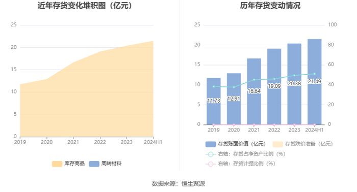 从存货变动来看,截至2024年上半年末,公司存货账面价值为21.49亿元,占净资产的51.07%,较上年末增加1.12亿元。公司本期没有计提存货跌价准备。