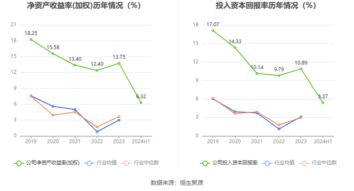 数据显示,2024年上半年公司加权平均净资产收益率为6.32%,较上年同期下降4.36个百分点;公司2024年上半年投入资本回报率为5.37%,较上年同期增长0.23个百分点。