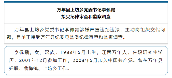 记者注意到,6月17日,上饶市纪委监委官方微信公众号曾发布李佩霞被查的消息。消息称,万年县上坊乡党委书记李佩霞涉嫌严重违纪违法,主动向组织交代问题,目前正接受万年县纪委县监委纪律审查和监察调查。公布的简历显示,李佩霞,女,汉族,1983年5月出生,江西万年人,在职研究生学历,2001年12月参加工作,2003年5月加入中国共产党,曾在万年县妇联、裴梅镇、上坊乡工作。