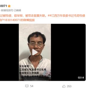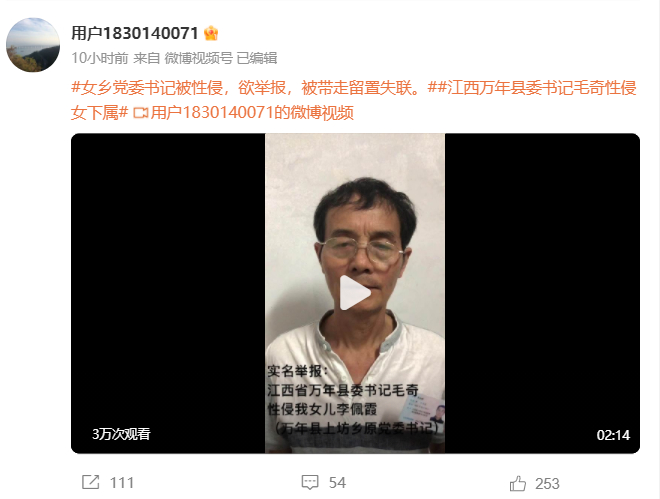 7月25日,江西省上饶市万年县委书记毛某被人通过网络实名举报涉嫌性侵女下属。
