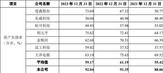 同一时期,同行业可比公司资产负债率(合并)分别为55.42%、61.19%和59.17%。泰金新能在所有同行业可比公司中,都属于最高。