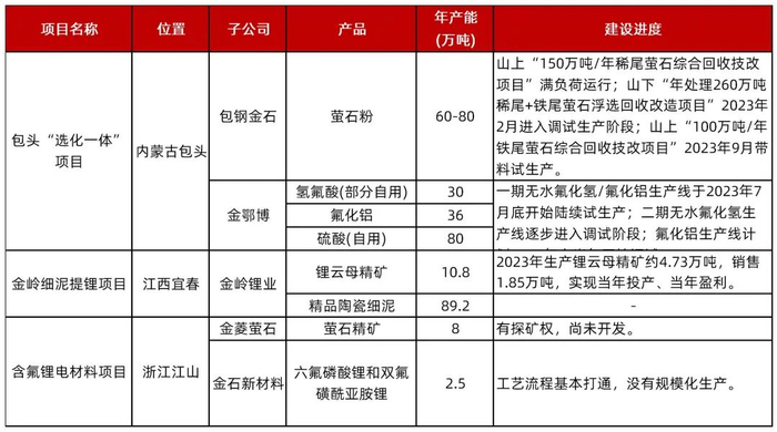 资料来源:公司2023年报,公司公告《关于控股子公司对外投资建设年处理100万吨锂云母细泥提质增值选矿厂建设项目进展的公告》、《关于对外投资合作开发包钢萤石资源综合利用项目的公告》、《关于控股子公司拟投资新建资源综合利用氟化工配套年产2X40万吨硫酸项目的公告》、《关于对外投资暨签署“项目投资协议书”的公告》,山西证券研究所