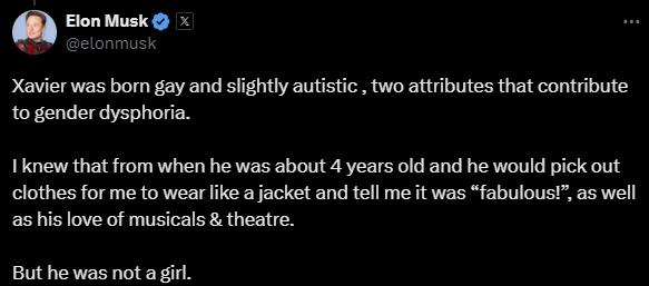 22日当天,马斯克还在社交平台X上发文称,威尔逊“出生就是同性恋,有轻微的自闭症,这两个特征导致了性别焦虑”。