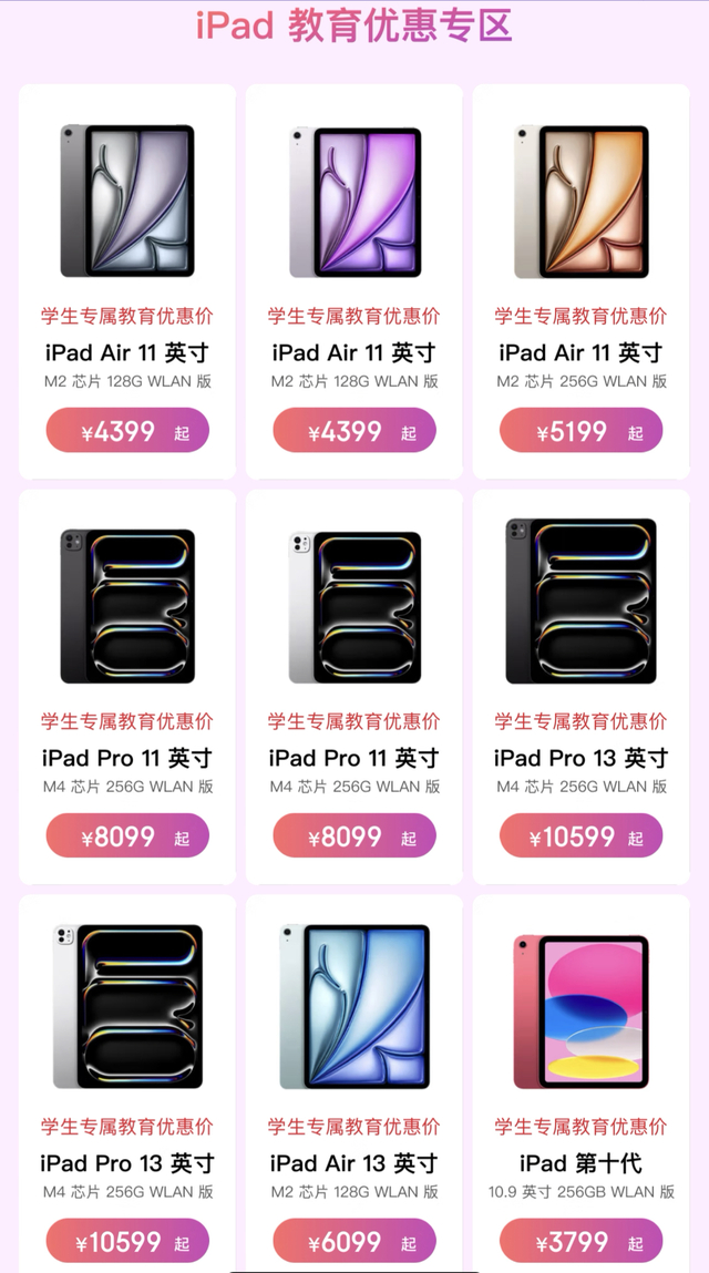 具体来看,64G版iPad(第10代)京东价2799元,iPad mini(第6代)64GB版京东价3599元,M2芯片、1TB版iPad Air限时直降800元,京东价8199元。不仅如此,今年新发布的iPad Air、iPad Pro也有重磅福利可享。其中128G、256G版iPad Air 13英寸M2芯片优惠400元,512G、1T版本优惠800元。屏幕采用标准玻璃的iPad Pro 11英寸256G版京东价8099元,采用标准玻璃的iPad Pro 13英寸256G版京东价10599元,到手价都超划算的。