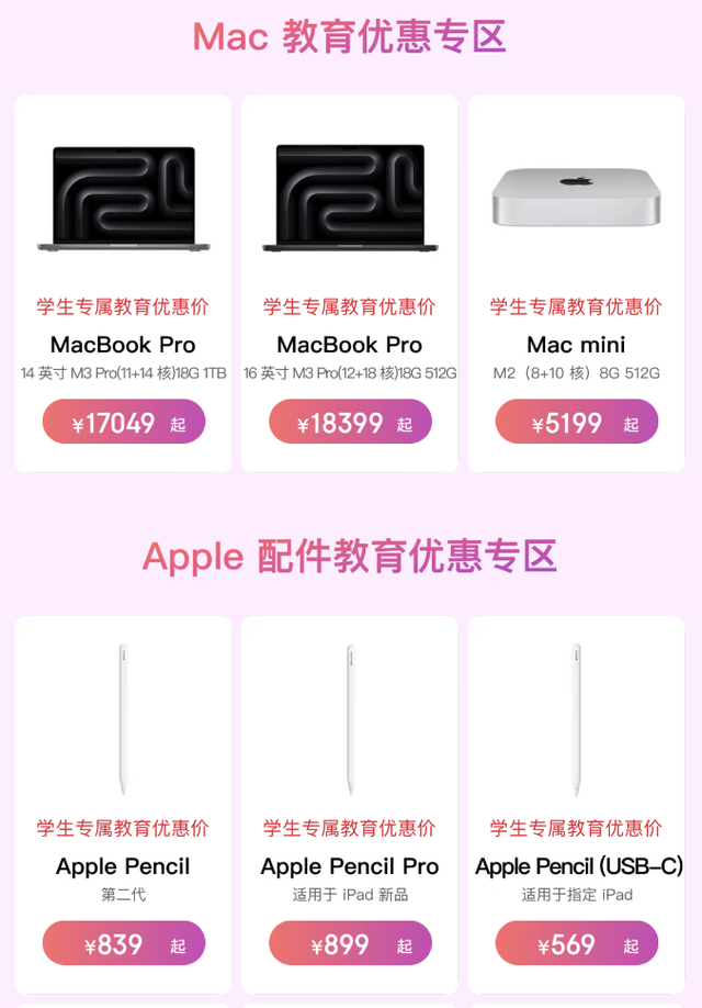 除了iPad,还有iMac、Mac mini、MacBook Pro系列产品也可享教育优惠。其中M3芯片MacBook Pro,14英寸1TB版教育优惠到手价17049元,16英寸512G版教育优惠到手价18399元,均可抢6期免息券,Mac mini迷你主机M2(8+10核)教育优惠到手价只需5199元。不仅如此,在京东买Apple Pencil、妙控键盘等配件也可使用教育优惠,不仅正品有保障,价格也超给力。