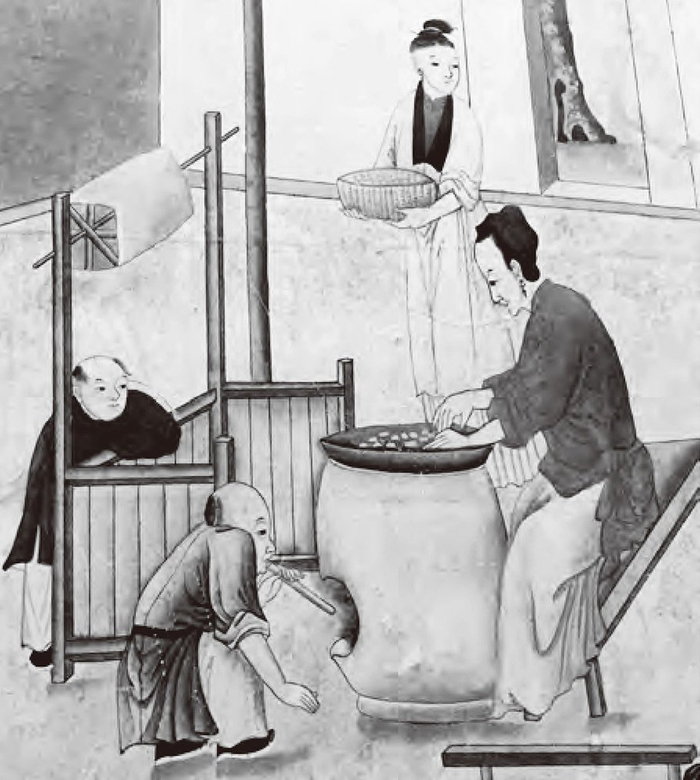 装饰在意大利产丝大区皮埃蒙特(Piedmont)的戈沃内城堡(Govone Castle)内的18世纪中国墙纸,墙纸上面描绘了缫丝的过程,虽然描绘的场景是传统中国人的缫丝过程,但画上人物的相貌已经为迎合外国观众而进行了欧化