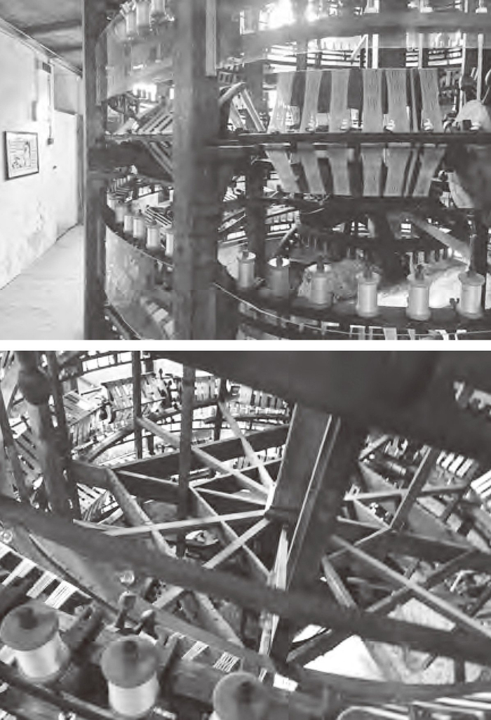 这座博物馆里最引人注目的展品是两台巨大的圆形捻丝机,它们的旋转动作让人联想到哥白尼的宇宙。这两台捻丝机有两层楼高,几乎全部由木头制成,每台机器里都装了许多直径16英尺的水平环,由柱子作为支撑。这些环围绕着一根巨大的轴旋转,这根轴向下延伸到隐藏在地下室的水车上。在每个环的边缘排列着数百个垂直的筒管,这些筒管每分钟旋转1000次。对于一个17世纪来自皮埃蒙特乡村的农民来说,这一定像是来自另一个世界的东西。