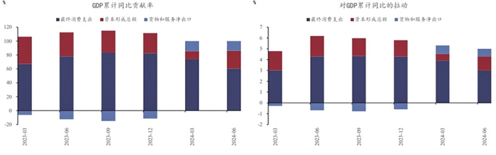 消费支撑明显下降。从GDP累计同比贡献率以及对GDP累计同比的拉动这两个角度比较消费、投资及净出口对于经济的支撑作用,可以看到今年上半年与去年全年相比,净出口的支撑效应提升得尤为明显。而从季度视角来看,今年二季度相比一季度,投资的贡献边际走强,与之相对的是,消费的拉动效应走弱,尽管从绝对值来说,消费支出对于国内生产总值同比的贡献及拉动都相当靠前,但其边际变化却相对偏弱。