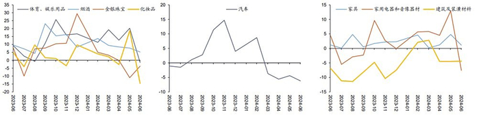 汽车消费在同比负增长区间进一步下探。6月汽车消费零售额同比为-6.2%,较前值下行1.8个百分点,继续对社零整体形成拖累。本月社会消费品零售总额同比增长2.0%,而除汽车以外的消费品零售额同比增长3.0%。基于数量及价格角度来看,汽车消费同比下行既有厂商降价的驱动,也有观望情绪下销量表现不佳的影响。事实上,“618”促销季各厂商对于购车推出了不少价格优惠,但“以价换量”取得的效果有限,并未给销量带来明显提振,根据乘联会公布的6月乘用车销量数据,6月全国乘用车市场零售176.7万辆,环比虽然增长3.2%,但同比仍为负增长,下降6.7%。消费者预期不佳叠加对于降价的观望情绪依然存在,价格持续下探的刺激效果并不明显。