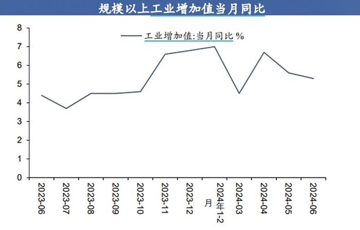 基数及弱需求拖累工业生产同比增速。中国6月规模以上工业增加值同比增长5.3%,相比前值小幅回落0.3个百分点。去年同期规模以上工业增加值环比增长0.78个百分点,今年6月环比而言则微涨0.42个百分点。
