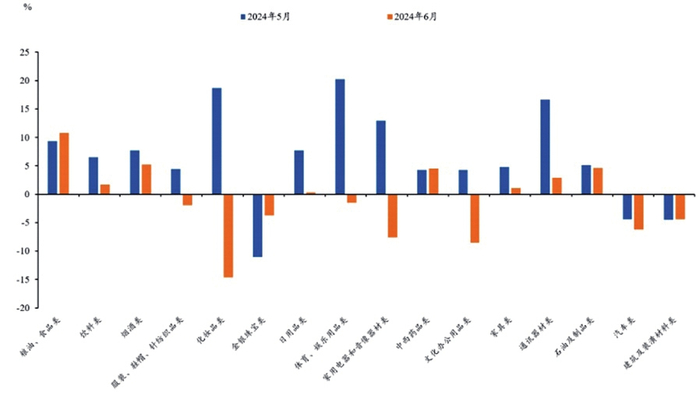 具体商品而言,可选消费贡献转弱。体育、娱乐用品类,化妆品类,通讯器材类,家用电器和音像器材类商品零售额同比5月增长,得益于大促活动提前展开,6月上述行业零售额较去年同期则显著回落,其中化妆品及体育、娱乐用品类同比转为负增长,回落幅度超过20个百分点。