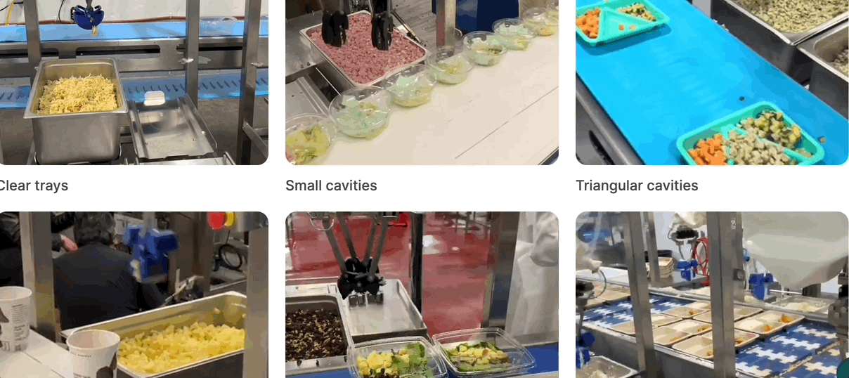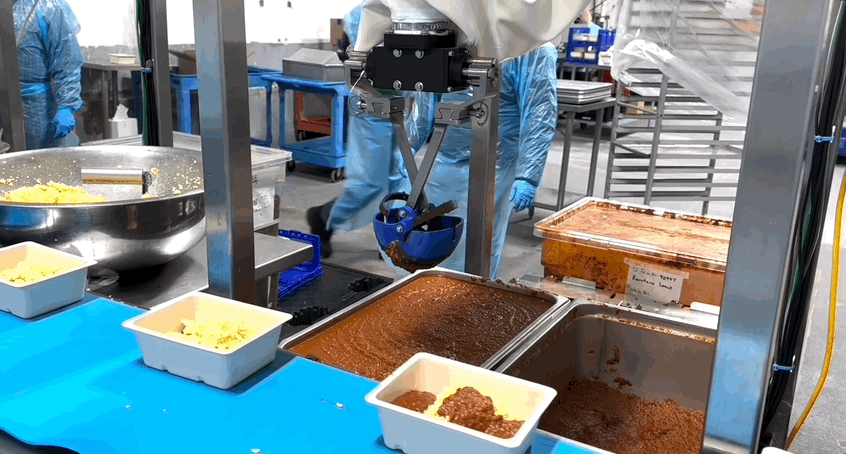 遇到不同形状的容器、不同速度的传送带,机器人总会让食物落到正确的地方。
