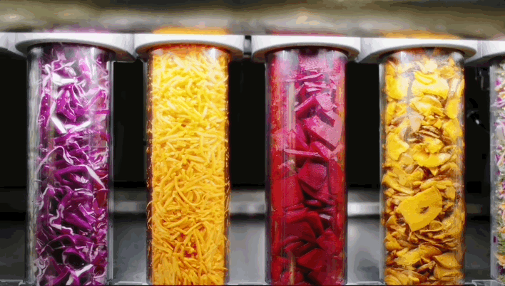 五颜六色的食材放置在管道里,机器人控制好份量,将羽衣甘蓝、奶酪等食材放到传送带上的碗中,并进行搅拌和混合。