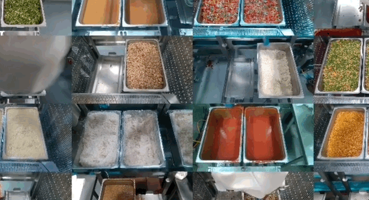 机器人不是做饭,而是「打饭」,有些类似后厨的切配工,根据菜谱预制各种冷冻食品,照顾国际口味,从印度咖喱鸡块,到意大利香蒜酱饺子。