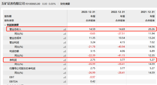 常伟自2022年2月接任五矿证券党委书记、董事长以来,公司业绩表现有所下滑,已连续两年营收和净利润“双降”。。2021年,五矿证券实现合并营业收入20.26亿元,净利润5.27亿元。然而,到了2022年,营业收入下降至14.69亿元,净利润降至3.77亿元。2023年,营业收入进一步降至14.59亿元,净利润为2.75亿元。