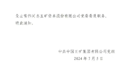 近日,中国五矿集团的一份党组文件在业界引起广泛关注。文件显示,五矿证券董事长常伟被免去五矿资本党委委员职务,并被聘任为集团公司专职外部董监事。常伟此前还担任五矿证券党委书记和董事长。