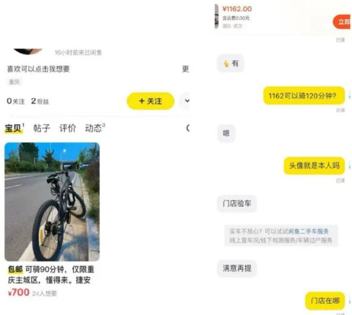 据报道,重庆的小苏想买一辆二手捷安特ATX660,看到了闲鱼上一位同城卖家,于是两人展开了一场“牛头不对马嘴”的对话。“我说660是铝合金车架,她图片上看着不对,对方却一直跟我说门店验车、满意再提,可以骑90分钟。”他告诉记者。