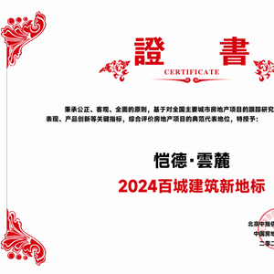 2024年7月4日,由北京中指信息技术研究院主办,中国房地产指数系统、中国物业服务指数系统承办的“中房指数2024房地产市场趋势报告会”在北京召开。会上,由恺德集团倾力打造的“第四代住宅”——恺德·雲麓,凭借先进的规划理念、建筑设计、园林品质、品牌价值等多方面表现,荣评“2024百城建筑新地标”。