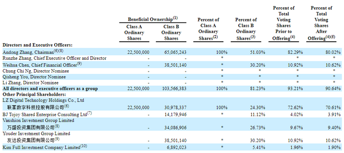 招股书显示,联掌门户在上市前的股东架构中,其股份包括A类股份(每股A类股份拥有10票投票权)2250万股、B类股份(每股B类股份拥有1票投票权) 12,750万股,股份合计15000万股。其主要股东包括: