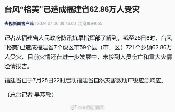 记者从福建省人民政府防汛抗旱指挥部了解到,截至26日6时,台风“格美”已造成福建省7个设区市59个县(市、区)721个乡镇62.86万人受灾。目前灾情还在进一步发展中,未接到人员伤亡和重大灾情险情报告。福建省已于7月25日22时启动福建省自然灾害救助Ⅲ级应急响应。