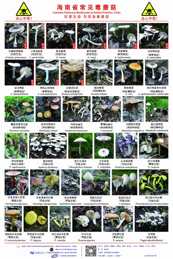 此前,曾念开教授团队联合海南省疾控中心等单位制作发布了海南省常见毒蘑菇挂图,挂图中包含了36种毒蘑菇,同时还列出了毒蘑菇的名字和中毒症状等,非常方便市民参考和分辨。在这些有毒蘑菇中,灰盖粉褶鹅膏、小致命鹅膏等9种蘑菇为剧毒,误食会导致肝损害、肾衰竭等。