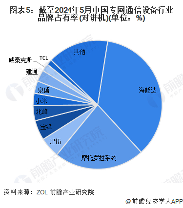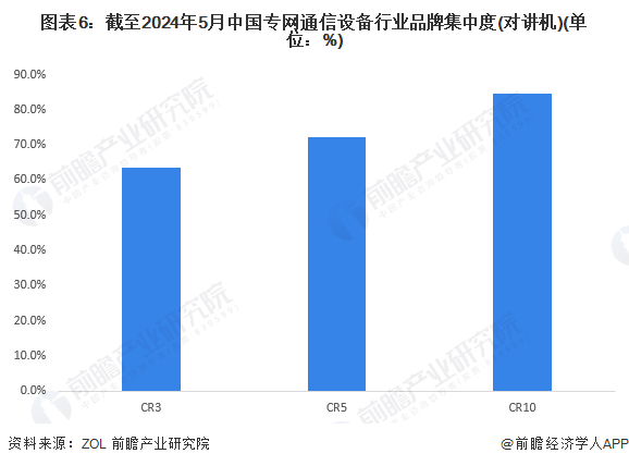 我国专网通信领域市场较为集中,技术领先同时拥有品牌及渠道优势的企业占据着行业大多数市场份额。截至2024年5月专网通信设备(对讲机)行业CR3企业市场份额合计达63.5%,CR5达72.3%,市场集中度较高。
