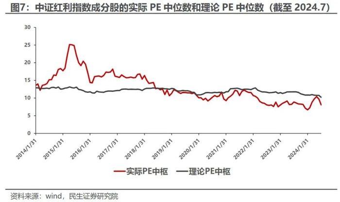 其次,理论PE中枢从2014年至今总体稳定,但有向下的趋势。2014年初的理论PE中位数为12.9,到2024年7月,PE中位数为10.2,有所下降。